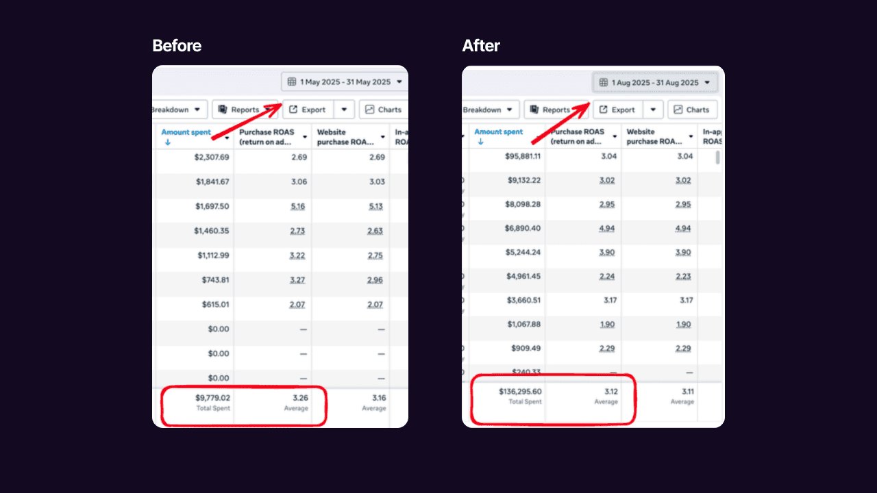 KUT came to us in May 2025 already seeing a solid 3.16x return on ad spend, but spending just $9,000/month. With Q3 being their peak season, they were looking for a partner who could strategically scale their Meta ads without losing profitability.